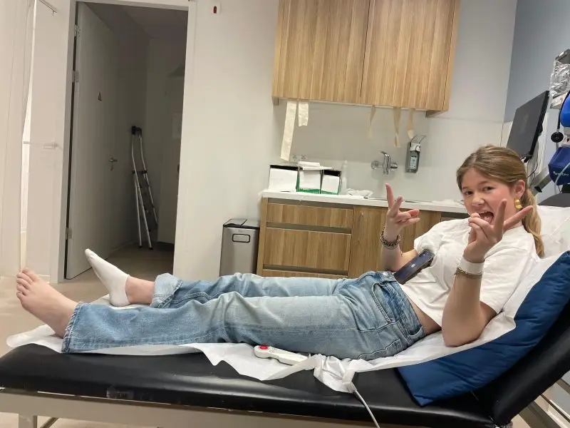 Maar nee, we kunnen direct terecht. Een uur later krijgen we de uitslag in het ziekenhuis: Gebroken middenvoetsbeentje. Waarop mijn dochter mij triomfantelijk aankijkt en zegt: “Ik zei het toch, ik voelde het al, net zoals met mijn gebroken schouder vorig jaar.”